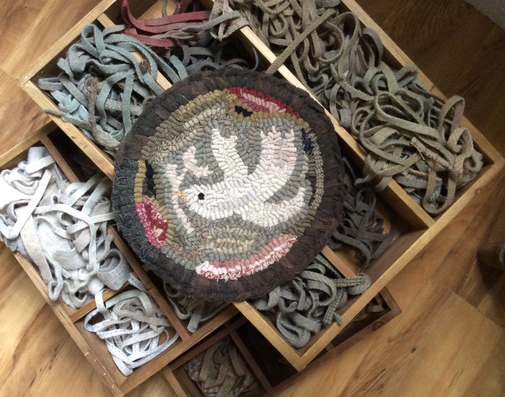 Sometimes I like to hook small pieces to give as gifts or to use as auction items for fundraisers. Hooking little mats is a great way to play with color, to experiment with an idea you may want to use later in a bigger rug.